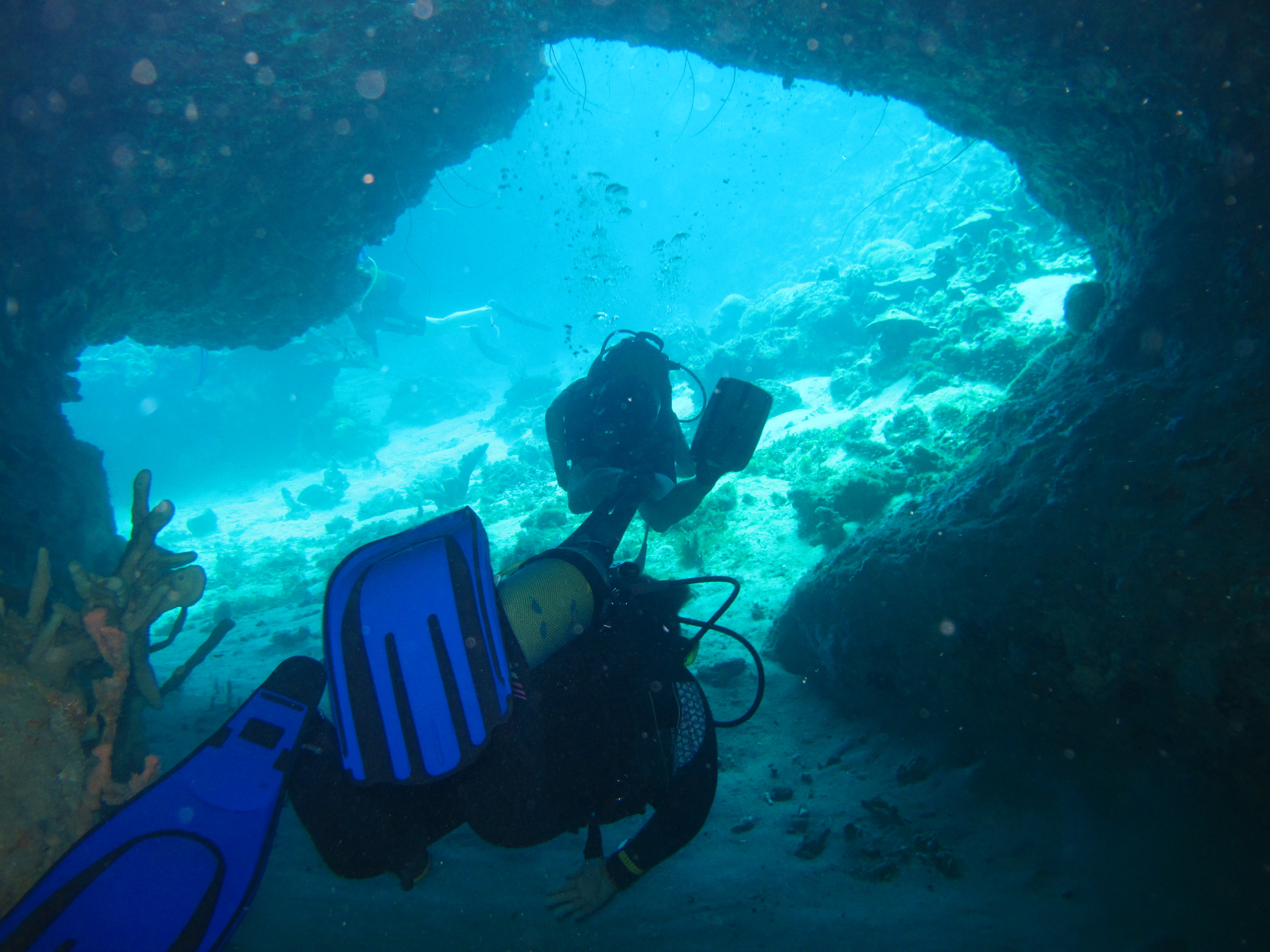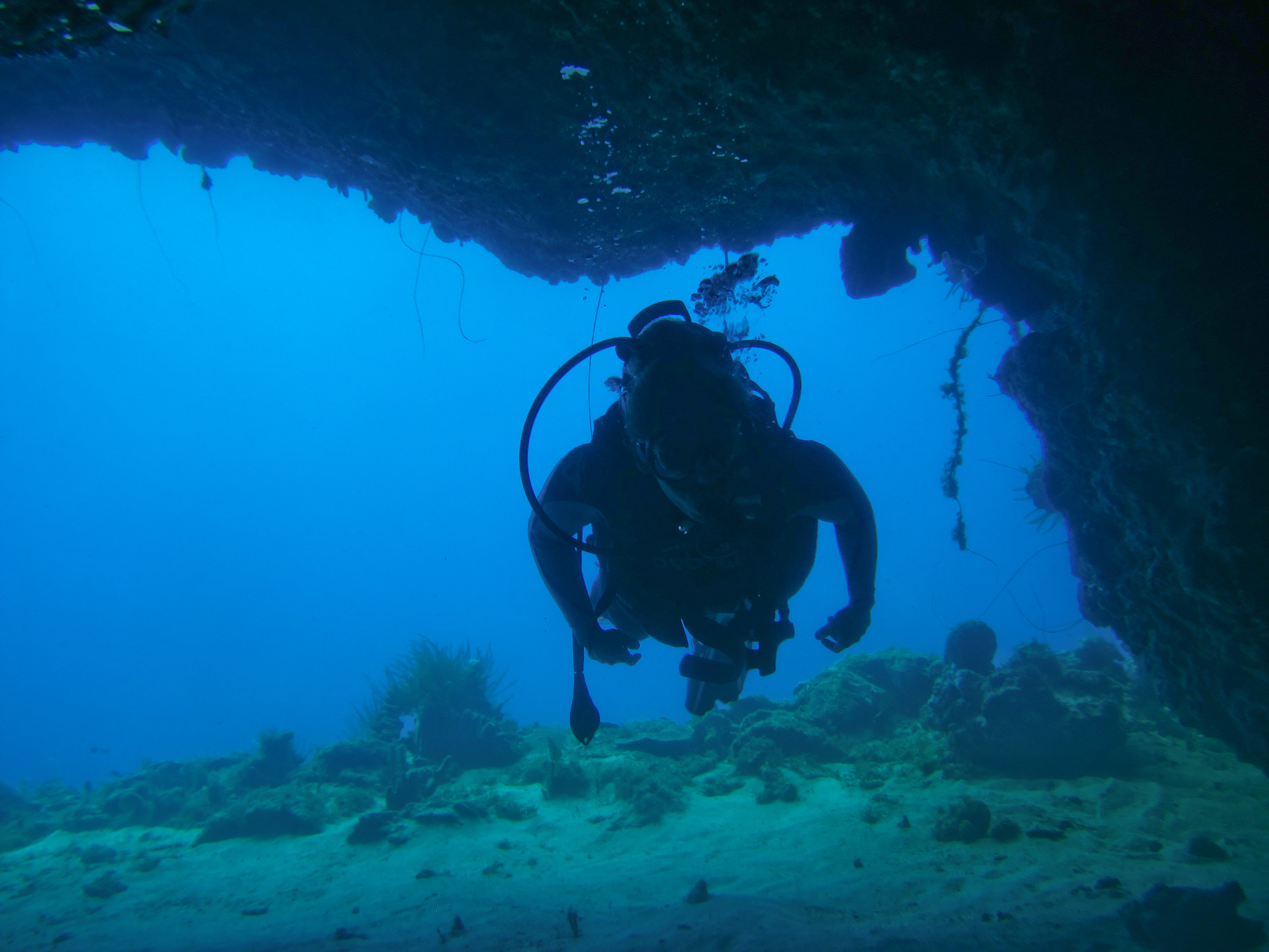 Le départ se fait du bateau sur une profondeur de 10m; rapidement en suivant le tombant on découvre un renfoncement dans lequel se trouve la 1ère grotte de cette plongée (-18m). En vous munissant d’une lampe vous pourrez faire ressortir de multiples couleurs et discerner une statue de pierre qui garde encore tout ses mystères. Le parcours reprend le long du tombant où vous pourrez admirer tout du long la vie marine qui y évolue : langoustes, murènes, poissons coralliens…avant d’arriver sur la 2ème grotte de cette plongée où se nichent de gros crabes araignée ainsi que des raies pastenagues, non rares sur ce site !